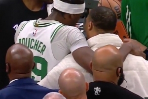GIF-布歇壓哨扔進(jìn)三分,威少不滿差點(diǎn)沖突,隨后雙方解釋互相友好退場