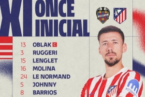 馬競首發(fā):13-奧布拉克、3-魯杰里、15-朗格萊、16-莫利納、24-勒諾爾芒、5-卡爾多索、8-巴里奧斯、14-馬科斯·略倫特、23-尼古拉斯·岡薩雷斯、9-瑟爾洛特、11-阿爾馬達