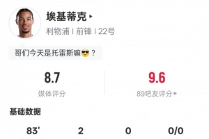 體育資訊2月1日訊 英超第24輪,利物浦主場(chǎng)迎戰(zhàn)紐卡斯?fàn)枴0;倏耸装l(fā)出戰(zhàn),6次射門4次射正,貢獻(xiàn)雙響,也錯(cuò)失2次進(jìn)球機(jī)會(huì),評(píng)分8.7。
