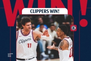 賽后快船官方發(fā)布贏球海報,封面為洛佩斯和科林斯擊掌瞬間。