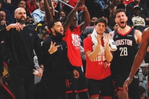 賽后火箭發(fā)布贏球海報,替補席慶祝瞬間成為封面,范弗里特、芬尼-史密斯、謝潑德和申京都入鏡,還有一位火箭助教。