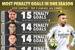 體育資訊02月03日訊 Score90統(tǒng)計了21世紀五大聯(lián)賽球員單賽季最多點球進球榜,姆巴佩本賽季至今目前以12粒點球位居第七位。
