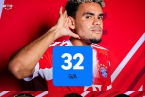 根據(jù)統(tǒng)計(jì),迪亞斯本賽季至今代表拜仁出場(chǎng)30次,打進(jìn)18球助攻14次,直接參與進(jìn)球32個(gè)。