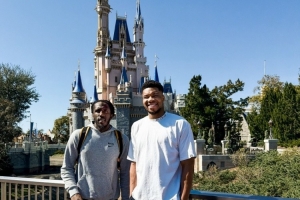 雄鹿官方社媒配文寫道:“兩個游玩迪士尼的大孩子?!?/p>