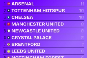體育資訊2月13日訊 Squawka統(tǒng)計(jì)了本賽季各隊(duì)在英超比賽中的頭球進(jìn)球數(shù)量,并列出榜單,阿森納11球最多,熱刺、切爾西10球次席。
