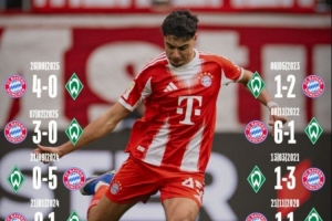 體育資訊2月14日訊 本輪德甲拜仁對陣不萊梅的比賽即將打響,拜仁官推也曬出兩隊近10次交鋒戰(zhàn)績。