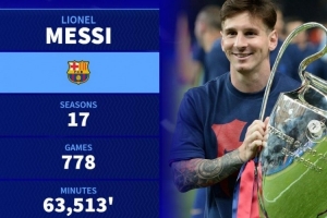 梅西(巴薩):17個(gè)賽季,778場(chǎng),63513分鐘,1.8億