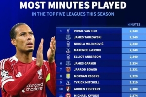 1-范戴克(利物浦),2340分鐘