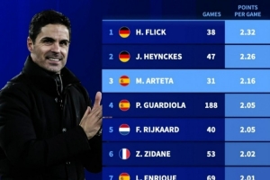 體育資訊1月21日訊 德轉盤點了自92/93賽季歐冠改制以來,至少帶隊25場的主帥中場均積分榜,其中弗里克居首,具體如下: