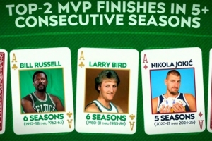 約基奇:20-21賽季至24-25賽季(連續(xù)5個(gè)賽季)