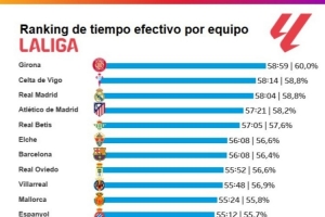 體育資訊3月3日訊 Opta統(tǒng)計了本賽季西甲各隊聯(lián)賽場均比賽凈時間,并列出榜單,赫羅納居首,皇馬第三、巴薩第七。