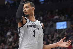 賽后,斯圖爾特接受了記者采訪。談到文班亞馬,他說道:“他是個高個子,占了很大的空間。我們必須更好地調(diào)動他,直接沖擊他的胸部(playing straight through his chest)。這對我們有幫助,也是他的弱點所在,當(dāng)防守者沖向他的胸部時(when he’s got defenders going at his chest),他會掙扎。”