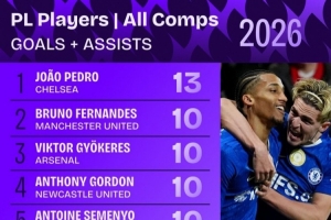 體育資訊3月8日訊 Squawka統(tǒng)計了2026年英超球員各賽事參與進(jìn)球數(shù)量,并列出榜單,若昂·佩德羅參與13球居首,B費(fèi)、約克雷斯、戈登、塞梅尼奧參與10球。
