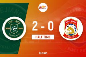 上半場補時3分鐘。半場戰(zhàn)罷,浙江隊2-0青島西海岸。
