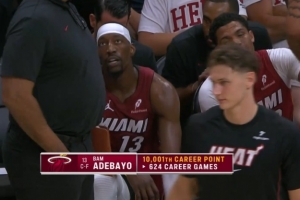 末節(jié)還剩5分鐘,阿德巴約上籃命中,本場比賽個(gè)人砍下第24分;本場比賽之前是9977分,這樣一來,他的生涯總得分來到10001分,用了624場比賽。