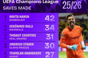 體育資訊1月23日訊 數(shù)據(jù)機構Squawka統(tǒng)計本賽季歐冠門將撲救次數(shù),博德閃耀門將尼基塔·哈伊金以42次居首。