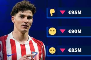 德轉(zhuǎn)給出了阿爾瓦雷斯身價變動的4個可能選項:9500萬歐元、9000萬歐元、8500萬歐元、8000萬歐元,目前阿爾瓦雷斯的身價為1億歐元,這也意味著他的身價一定會迎來下跌。