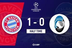 上半場(chǎng)補(bǔ)時(shí)3分鐘。半場(chǎng)戰(zhàn)罷,拜仁1-0亞特蘭大。