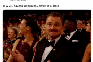 這意味著馬競(jìng)將在10天內(nèi)3次對(duì)陣巴薩,馬競(jìng)官方社媒曬出萊昂納多·迪卡普里奧在奧斯卡頒獎(jiǎng)典禮上一臉無(wú)奈的照片,配文:“當(dāng)你不得不在10天內(nèi)3次對(duì)陣巴薩的感受?!?/p>