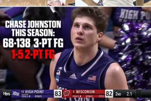 本場比賽,海波特大學(xué)后衛(wèi)蔡斯·約翰斯頓成為球隊取勝功臣,值得一提的是身為三分球?qū)<业乃緢霰荣惽百惣救?32投64中,兩分卻是4中0,本場比賽過后,三分變成138中68,兩分5中1,而這唯一的兩分球就是最關(guān)鍵的上籃絕殺(此前追到只差1分的三分球也是他投的)!
