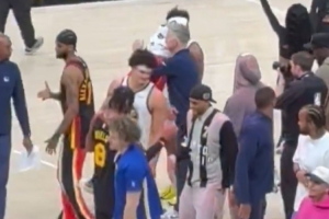 這是庫明加被交易后首次面對老東家,賽后他和前隊友擁抱致意,也和主教練科爾簡單握手擁抱,最后還和庫里聊了一會。