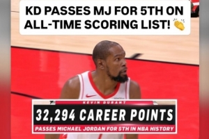 在本場(chǎng)比賽中,杜蘭特生涯總得分32294分,超越喬丹,上升至歷史第五。