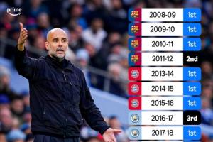 據(jù)轉(zhuǎn)播商亞馬遜統(tǒng)計(jì),瓜迪奧拉執(zhí)教生涯至今從未連續(xù)兩個(gè)賽季無緣聯(lián)賽冠軍。