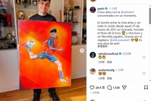 體育資訊3月26日訊 西班牙中場(chǎng)佩德里更新社媒動(dòng)態(tài),曬出與一幅以他為主題的畫(huà)作。