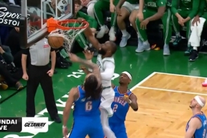 GIF-杰倫·布朗單臂隔扣,疑似大拇指割喉動(dòng)作慶祝