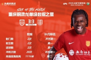 體育資訊3月26日訊 中超第3輪,重慶銅梁龍3-3戰(zhàn)平成都蓉城,據(jù)銅梁龍官方統(tǒng)計,迪馬塔和吳宇曦成為本輪隊內(nèi)關(guān)鍵球員。