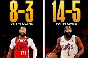 哈登出戰(zhàn)時,騎士隊(duì)14勝5負(fù)。