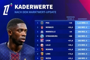 體育資訊3月28日訊 德國轉(zhuǎn)會(huì)市場(chǎng)更新了法甲球員的身價(jià),并列出法甲球隊(duì)身價(jià)排名,巴黎12.2億歐斷層居首,摩納哥3.92億歐次席。