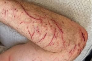 希勒寫道:“自行車道上的坑洼可真不好?!眻D中希勒的手臂和腿部有多處割傷和擦傷。