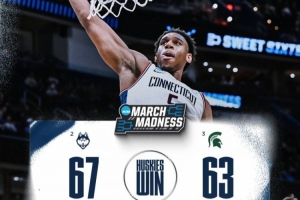 體育資訊3月28日訊 NCAA瘋?cè)?6進8,康涅狄格大學(xué)67-63險勝密歇根州立大學(xué),晉級16強。