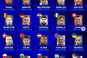 體育資訊3月29日訊 德國轉(zhuǎn)會市場盤點了歐足聯(lián)旗下各隊歷史身價最高球員,亞馬爾、哈蘭德和姆巴佩2億歐并列榜首,C羅最高1.2億歐。