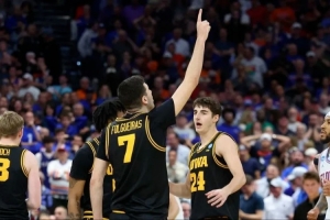 當(dāng)完賽的蜂鳴器響起的瞬間,愛荷華大學(xué)的隊(duì)員們互相擁抱慶祝,他們淘汰了衛(wèi)冕冠軍佛羅里達(dá)大學(xué),自1999年以來首次晉級甜蜜十六強(qiáng)。