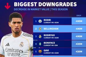 體育資訊03月31日訊 德轉(zhuǎn)盤點了本賽季目前球員身價下跌榜,其中羅德里下降4500萬歐最多,貝林、羅德里戈下降4000萬歐。