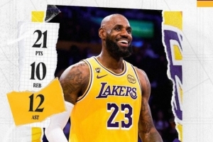 賽后,湖人官方發(fā)布詹姆斯三雙數(shù)據(jù)海報。