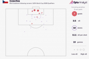 世預(yù)賽歐洲區(qū)比賽,捷克已經(jīng)通過角球打進(jìn)7球,位居歐洲區(qū)所有球隊之首。