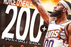 據(jù)太陽(yáng)官方統(tǒng)計(jì),這是奧尼爾賽季第200記三分,是隊(duì)史第六個(gè)達(dá)到這一成就的球員。