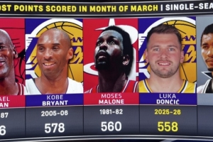 本場比賽過后,東契奇三月(當?shù)貢r間)總得分達到600,是喬丹(676分)之外歷史上唯一在三月份總得分600的球員。