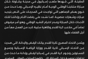 此役西班牙球迷在場(chǎng)上呼喊種族歧視口號(hào),對(duì)此埃及足協(xié)發(fā)布聲明:“埃及足球協(xié)會(huì)強(qiáng)烈譴責(zé)在巴塞羅那西班牙人球場(chǎng)進(jìn)行的埃及國(guó)家隊(duì)與西班牙國(guó)家隊(duì)友誼賽中發(fā)生的令人發(fā)指的種族主義事件,部分現(xiàn)場(chǎng)觀眾高喊種族主義口號(hào),這種行為我們予以完全拒絕和嚴(yán)厲譴責(zé)。此外,對(duì)于比賽中出現(xiàn)的不尊重埃及國(guó)歌的行為,我們同樣表示堅(jiān)決反對(duì),此類行為在足球場(chǎng)上是絕對(duì)不可接受的,是一種必須攜手根除的負(fù)面現(xiàn)象。