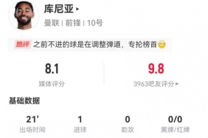 體育資訊1月26日訊 曼聯(lián)在本輪英超焦點戰(zhàn)3-2力克阿森納,庫尼亞本場數(shù)據(jù)如下: