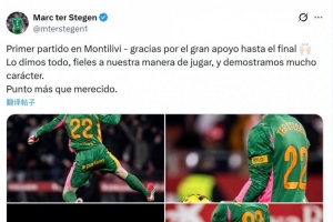特爾施特根社媒曬出比賽照片,并寫(xiě)道:“我在蒙蒂利維的首場(chǎng)比賽,感謝大家一直到最后的全力支持?!?/p>