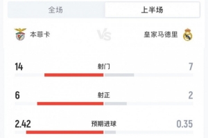 體育資訊1月29日訊 歐冠聯(lián)賽階段第8輪,本菲卡主場對陣皇馬,半場主隊2-1領(lǐng)先,兩隊半場數(shù)據(jù)如下(本菲卡在前):