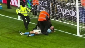 【哈寶:我不干凈了??】曼城打入第三球后,一名球迷沖進(jìn)球場(chǎng)對(duì)躺在地上的哈蘭德又抱又親,隨后被保安人員拉離球場(chǎng)。這粒進(jìn)球后來(lái)被判無(wú)效。