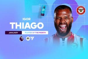 1月份伊戈?duì)枴さ賮喐瓿鰬?zhàn)5場(chǎng)比賽打進(jìn)5球,幫助布倫特福德取得2勝1平2負(fù)的戰(zhàn)績(jī),他也擊敗了恩佐、多爾古、維爾茨等候選,繼去年11月后第二次當(dāng)選英超月最佳球員。