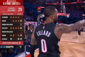 第二位出場(chǎng)的利拉德依然延續(xù)了首輪的炸裂手感,中圈5個(gè)點(diǎn)全中拿下29分的高分;