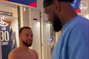 體育資訊2月16日訊 今天將進(jìn)行全明星正賽較量,賽前一眾球星在更衣室打招呼。
