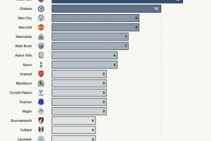 第二、第三名分別為南安普頓和西漢姆,均為12次,緊隨其后的則是切爾西、曼城和曼聯(lián)。